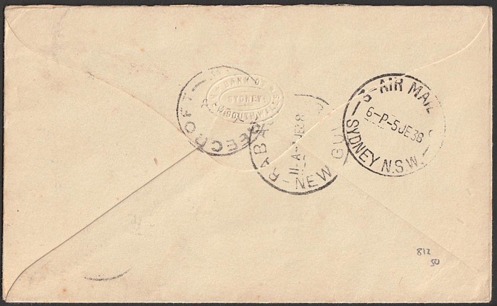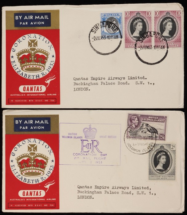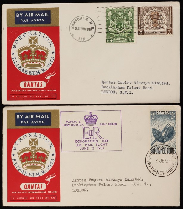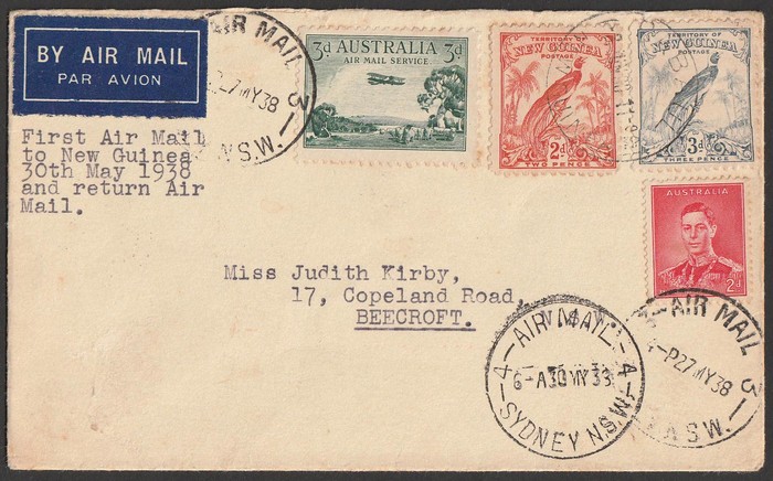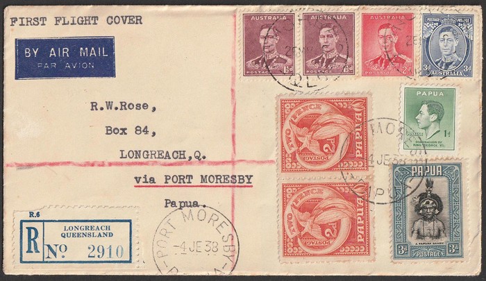 Australia-Papua-New 'boomerang' FFC franked KGVI 1½d pr, 2d & 3d & Papua Pics 2d pr & 3d, & KGVI 1d tied by Longreach cds. 2nd franked Airmail 3d green & KGVI 2d, with Undated Birds 2d & 3d - numerous b/s. AAMC 812 cat $100+. (2). (Image1) (Image2)