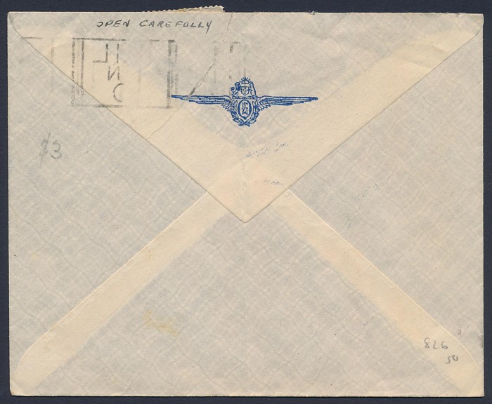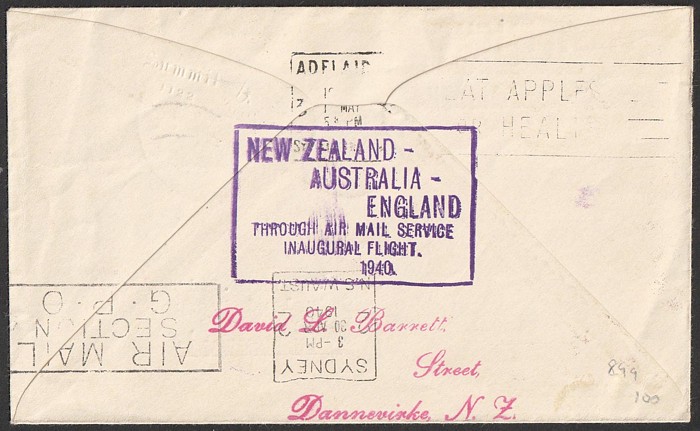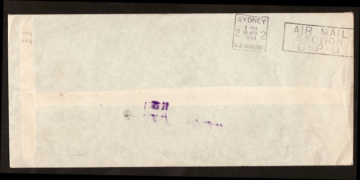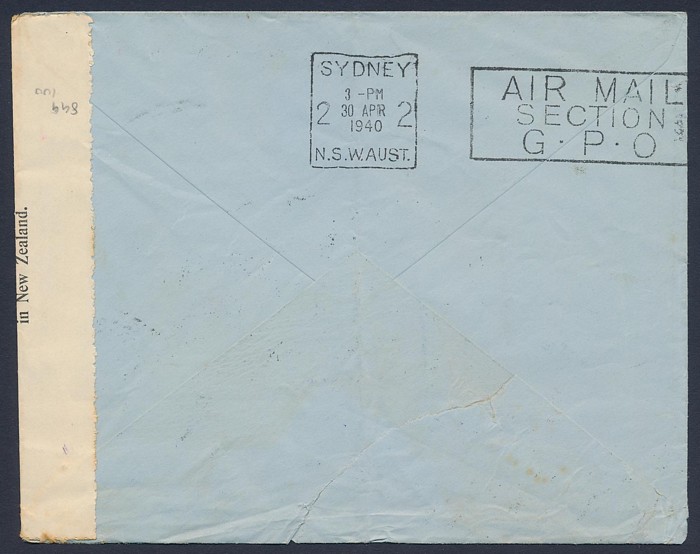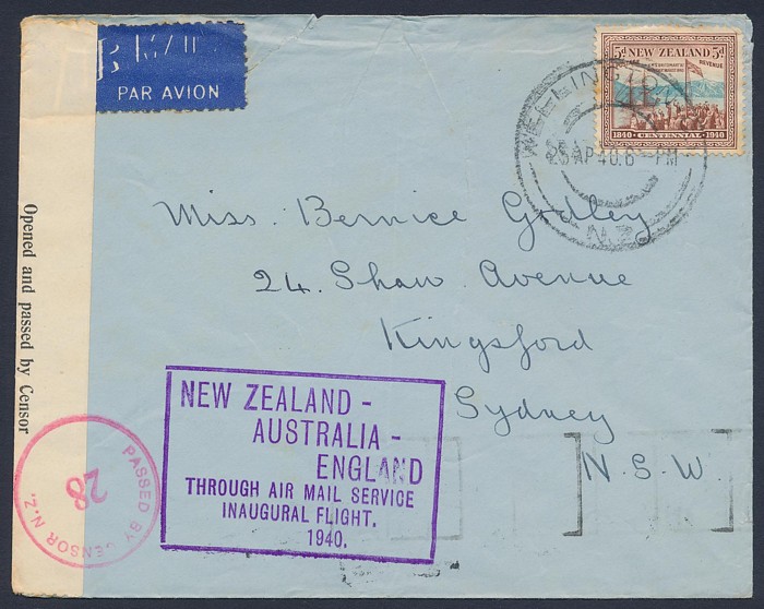 Zealand-Australia cover franked Centennial 5d tied by 'Wellington 25 AP 40' cds, with flight cachet, plus censor tape & cachet. AAMC 899 cat $100. (Image1) (Image2)