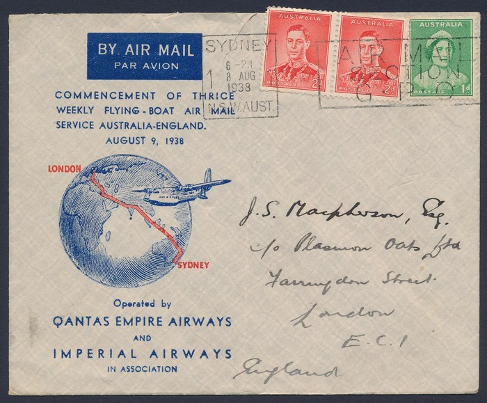 England cover (vert fold) thrice weekly Flying Boat Service pictorial franked Queen 1d & KGVI 2d (2), tied by 'Sydney 8 AUG 1938' pmk. AAMC 822b cat $275. (P) (Image1)