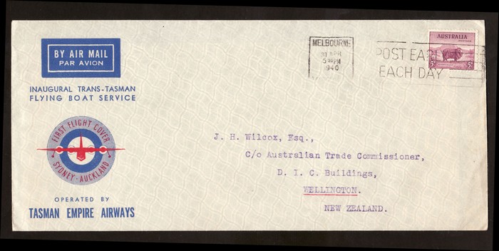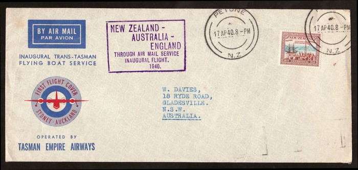 Flying Boat service FFC franked Centenary 5d tied by 'Petone 17 AP 40' cds, plus return flight franked Ram 5d tied by Melbourne 31 APR 1940 pmk. AAMC 899 & 900 cat $200. (2).