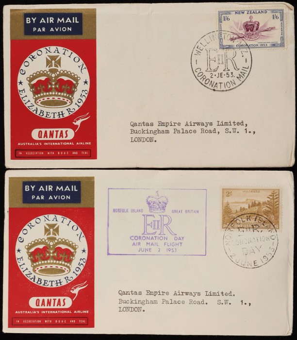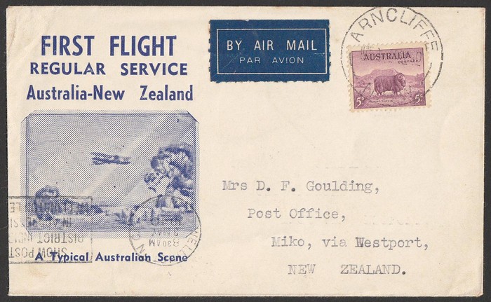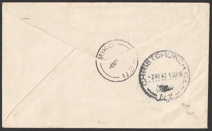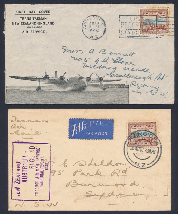 Zealand-Australia cover franked Centennial 5d tied by 'Rangiora 26 AP 40' cds with flight cachet. Also same service later flight Pictorial cover franked 5d again tied 'Auckland 11 MY 1940' pmk. AAMC 899 & 899(var) cat $100 for 1st flight, plus later