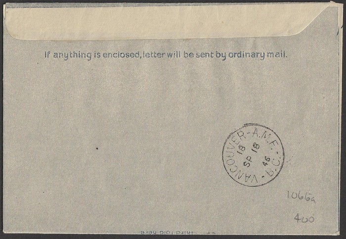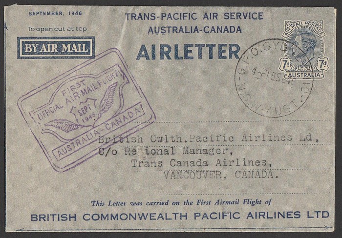 Australia-Canada KGV 7d Airletter with 2-line printed cachets top & base, with Sydney 15 SE 46' cds. To Vancouver with flight cachet & arrival b/s. AAMC 1066a cat $400. (P)