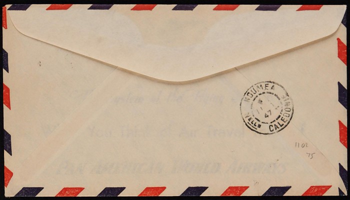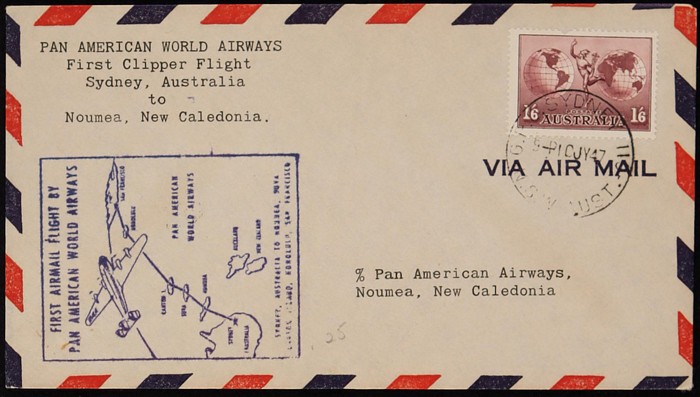 New Caledonia FFC by Pan Am franked Hermes 1/6 tied by 'Sydney 10 JY 47' cds, with Pic flight cachet, Noumea b/s. VF. AAMC 1102 cat $75. (Image1) (Image2)