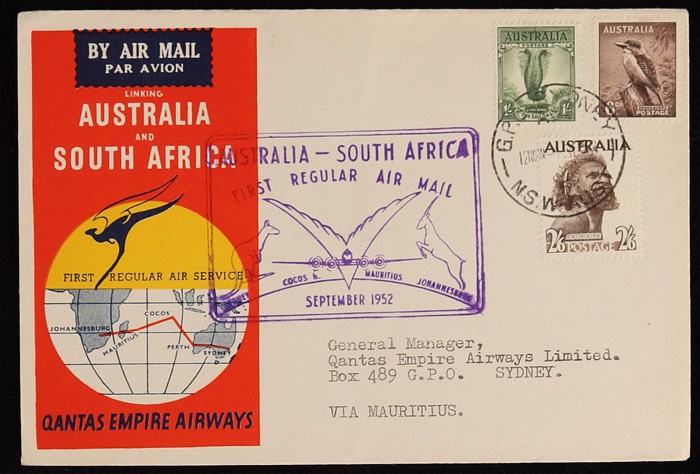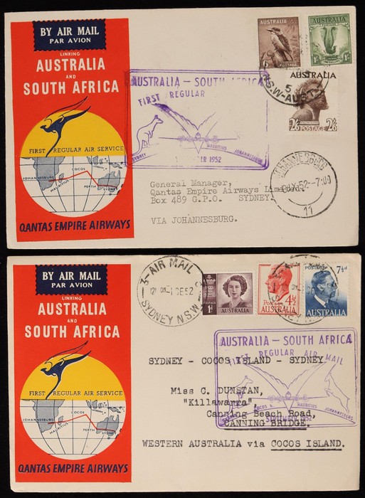 Sth Africa & return 'boomerang' covers to Cocos Is, Mauritius & Sth Africa. VF. AAMC 1308a cat $150. (3) (Image1) (Image2)