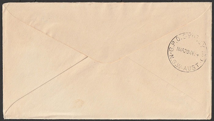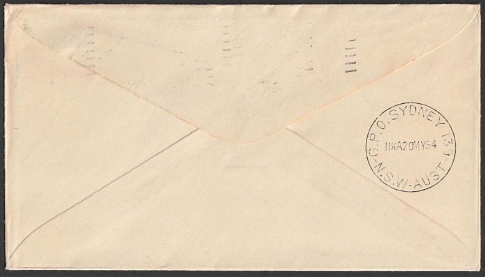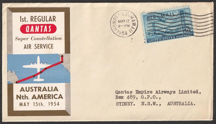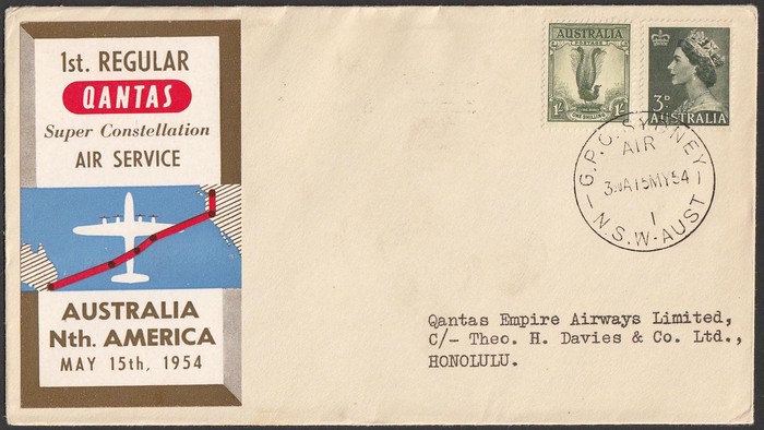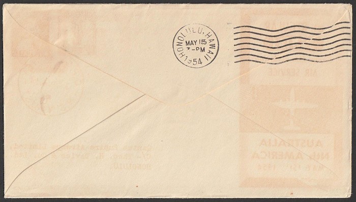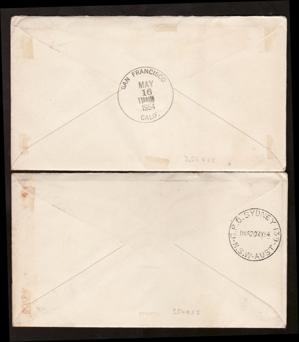 2667 image1954 Australia-Hawaii FFC franked Lyrebird 1/- & QEII 3d tied by Sydney 15 MY 54 cds. Also return flight franked US Bridge 25c tied by Honolulu May 17 1954 pmk. AAMC 1345b cat $100. (2). (Image1) (Image2) (Image3) (Image4)