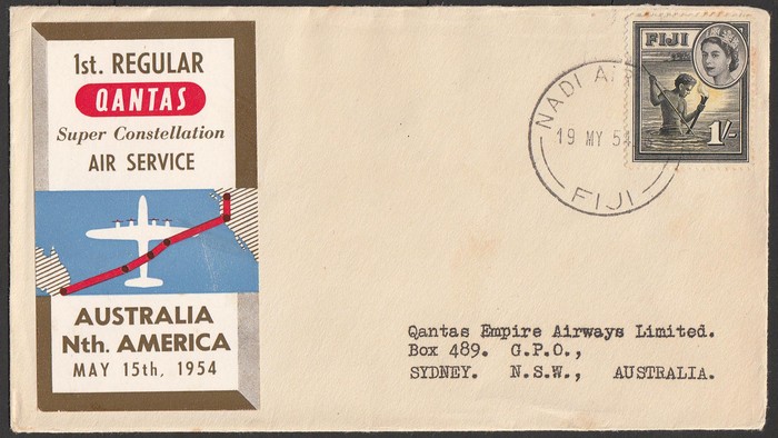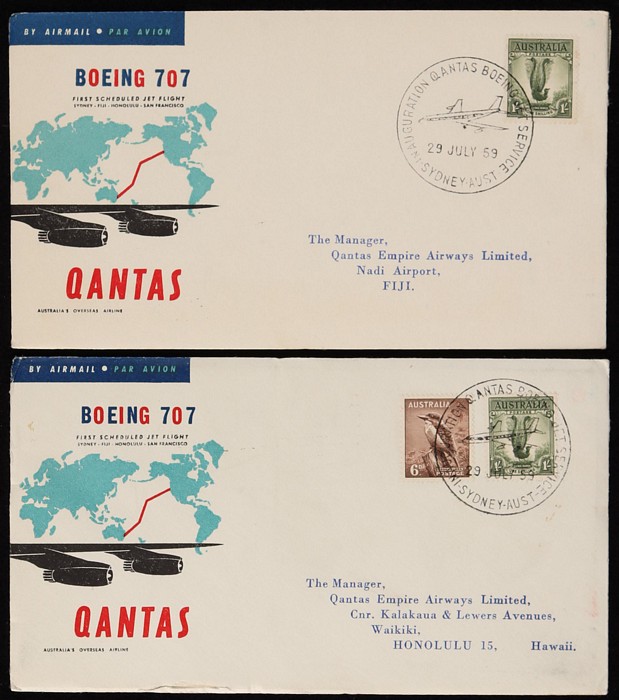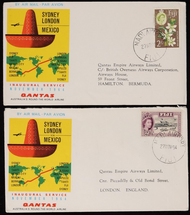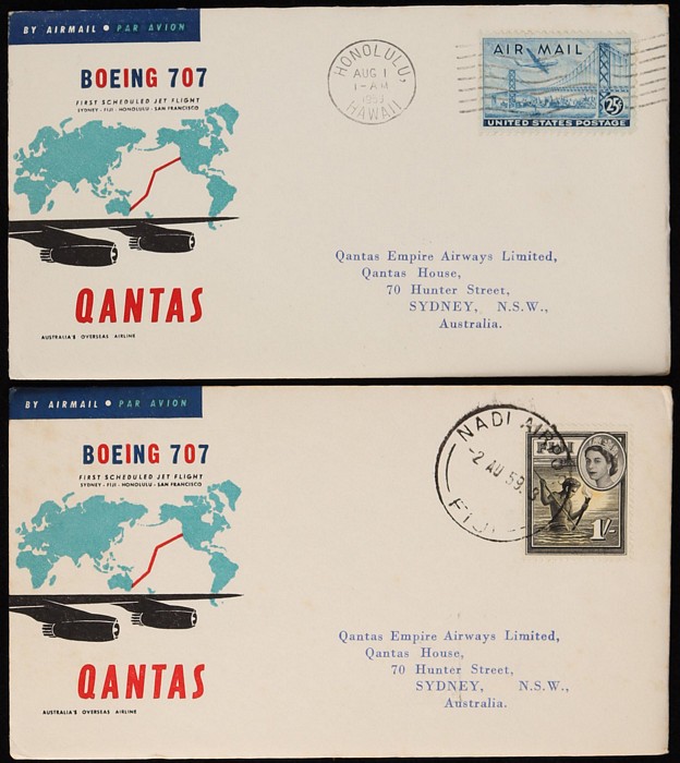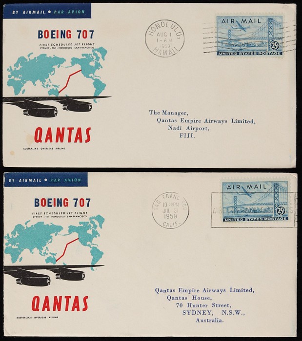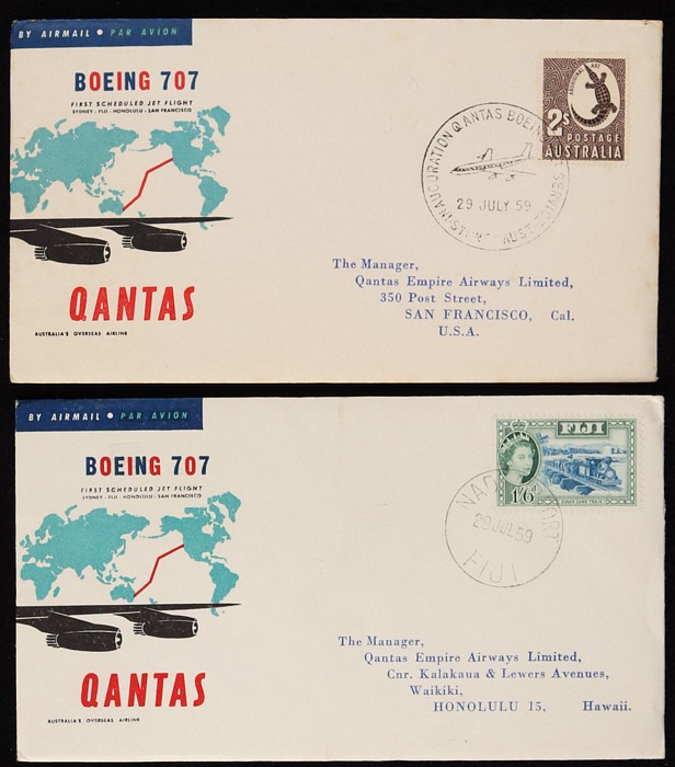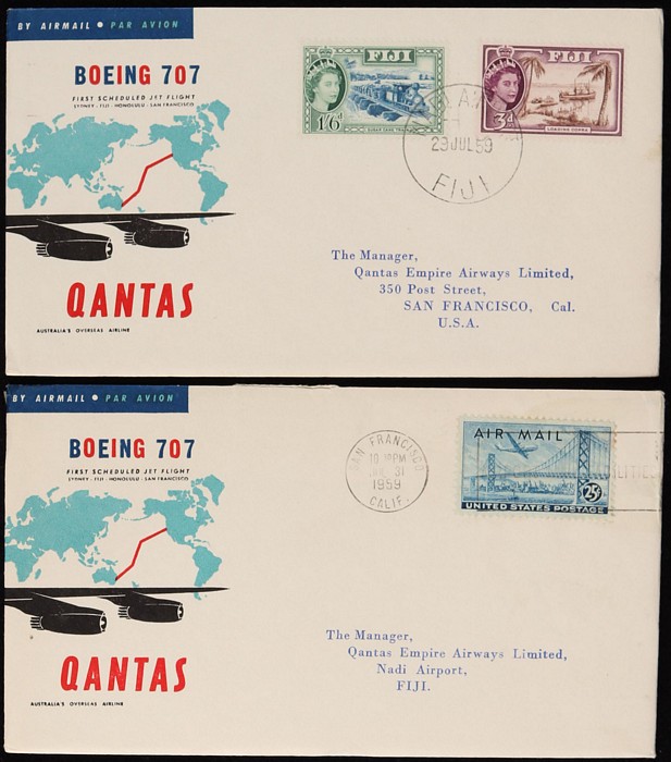 2671 image1959 Sydney-San Francisco FFC plus intermediates for Sydney to Fiji & Hawaii, plus Fiji to Hawaii & San Fran. Then return flight San Francisco & Hawaii to both Fiji & Sydney, plus Fiji to Sydney. AAMC 1406, 07 & 07a cat $185. (10) (Image1) (Image2) (Image3) (Image4) (Image5)