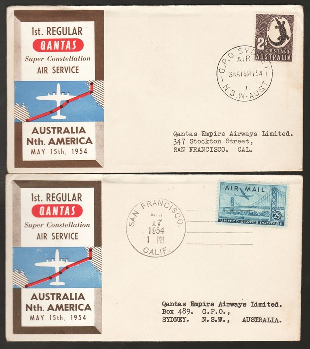 2669 image1954 Australia - Nth America QANTAS 1st Regular Flights, (2), Sydney - San Francisco & return both with multi-coloured vignettes. AAMC 1345 a, 1345 b(var) cat $120 as 2 loose vignettes. (Image1) (Image2)