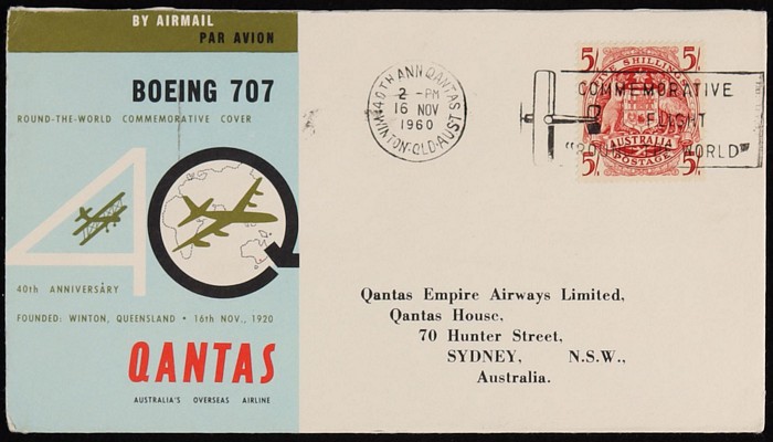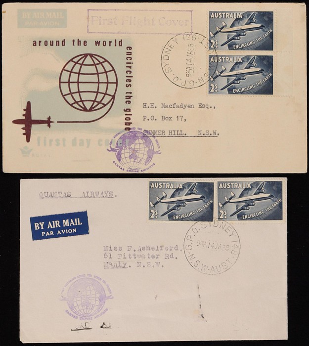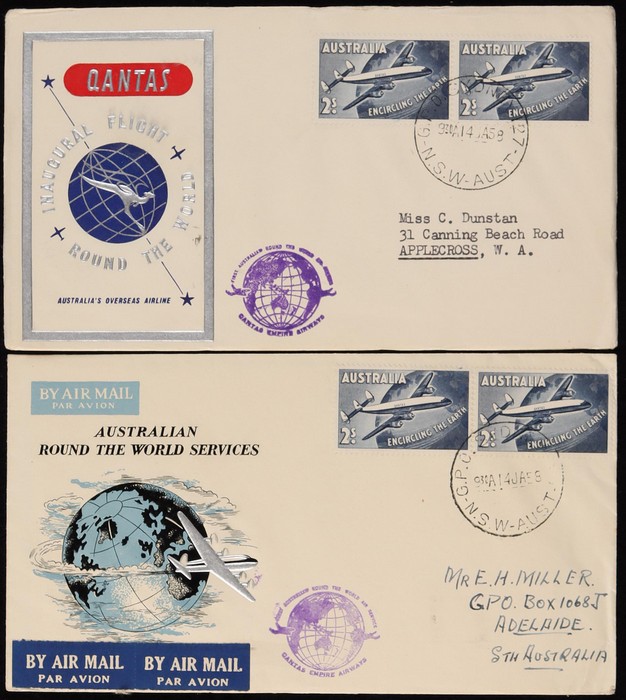 2670 image1958 QANTAS Round The World flight, ea franked QANTAS 2/- (2) tied by 'Sydney 14 JA 58' cds & with flight cachet. 3 diff Pic covers & a plain cover, all with return arrival b/s. Plus the 1960 Round-World flight franked Arms 5/-. VF. AAMC 1386 & 1443 cat $95. (5) (Image1) (Image2) (Image3)