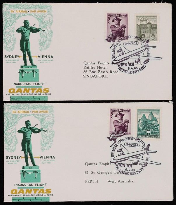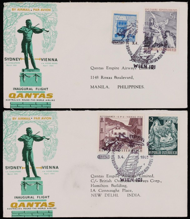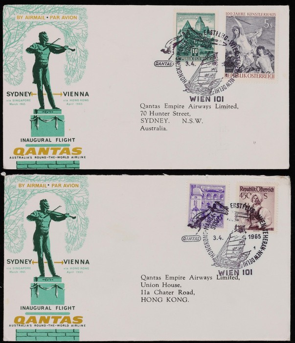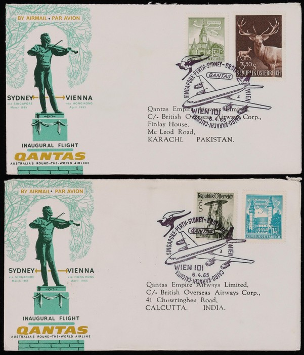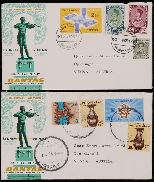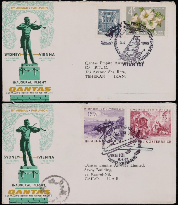2673 image1965 Sydney - Vienna via Hong Kong with Sydney, Hong Kong, Philippines, India & Iran, plus return flight Egypt, Pakistan, India & Singapore. Also earlier March/April flight Thailand & Egypt to Vienna intermediates. AAMC 1543a & 1546-47a cat $350. (12) (Image1) (Image2) (Image3) (Image4) (Image5) (Image6)