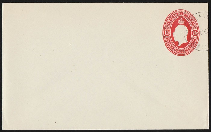 2679 imageEnvelope: 1928 KGV oval 1½d red. Superb fresh CTO 'Melbourne 20 DE 28' cds. ACSC EP31w cat $200+. Only 416 printed for UPU distribution. (P) (Image1) (Image2)