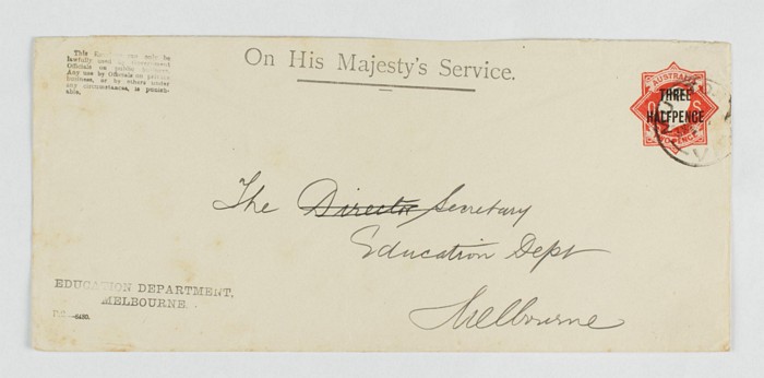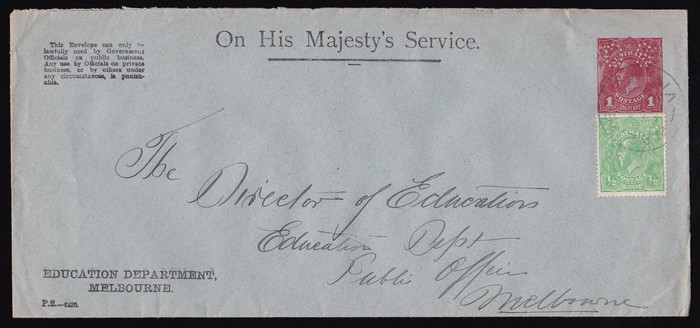 2682 imageEnvelope - Official: 1919 use of KGV 1d red OS dots in die, type 1, for Education Dept Melbourne, uprated KGV ½d yellow-green perf OS, with 'Walpeup 29 JL 19' cds. ACSC EO4A cat $150. (Image1)