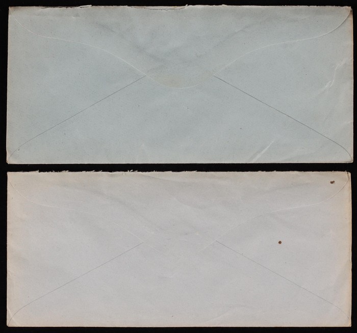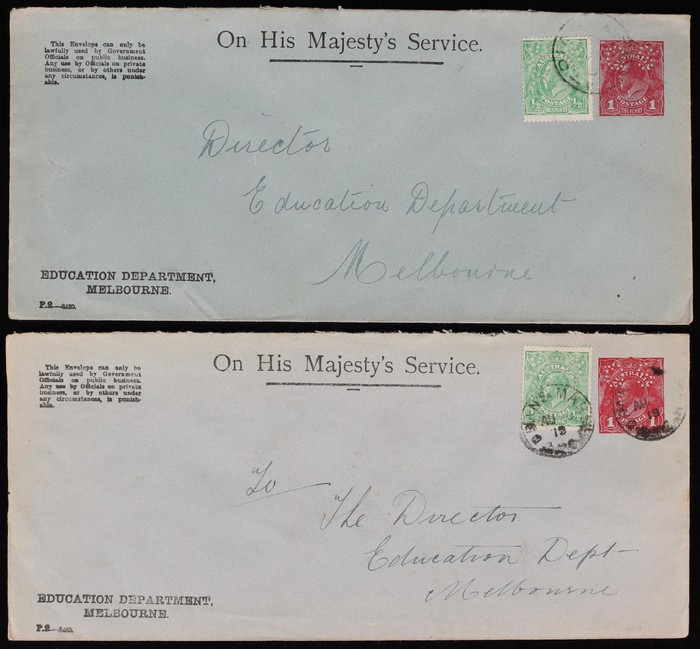 2683 imageEnvelopes - Official: 1919-20 uses of KGV 1d red OS in dots type for Education Dept Melbourne with ½d green tied by Marsh & another cds, with pale grey, or darker blue-grey stocks. ACSC EO4A cat $400. (2) (Image1) (Image2)