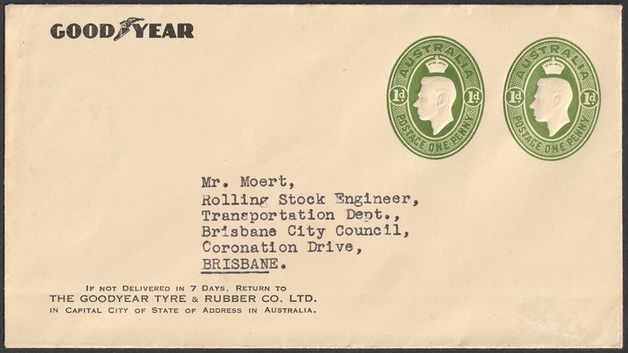 1940-41 KGVI 1d green embossed DOUBLTON. Superb condition - addressed but w/o pmk & flap stuck. ACSC ES76 cat $4000 UN or $2000 U. Extremely rare with only several recorded. (P)