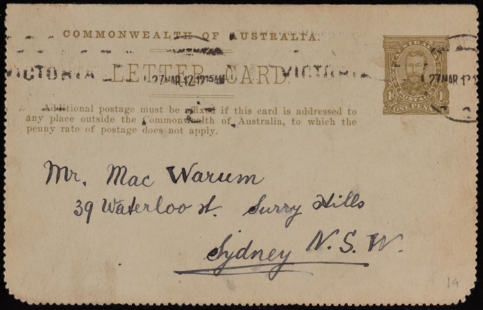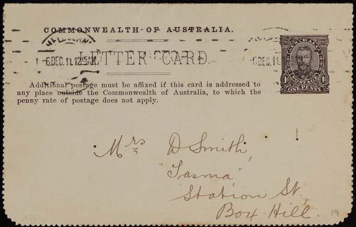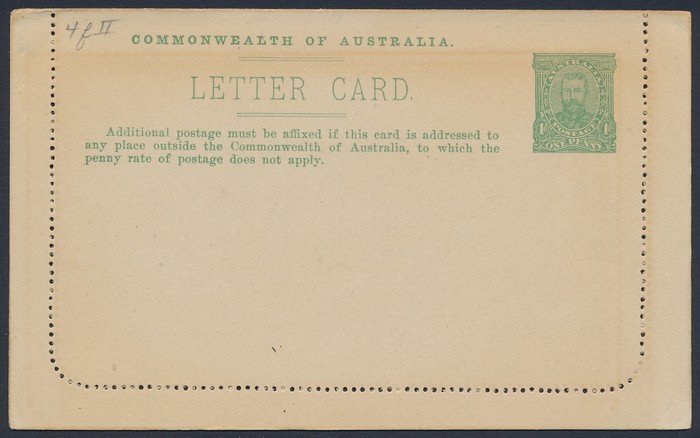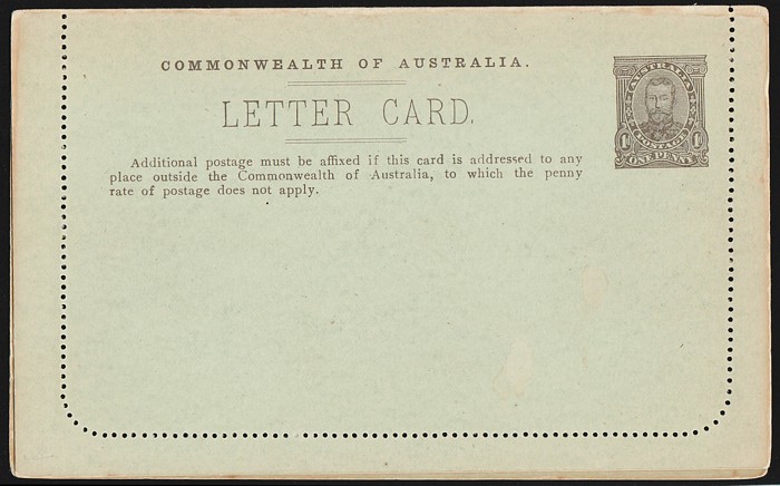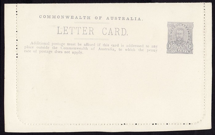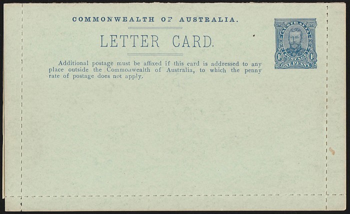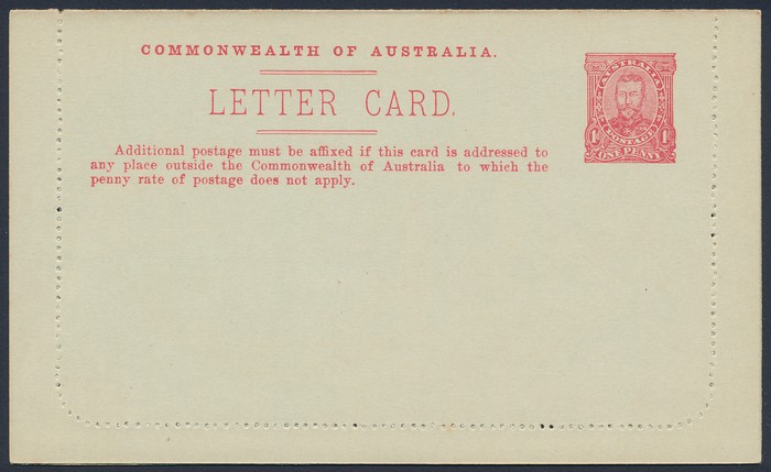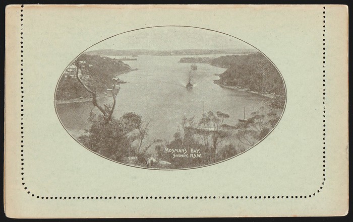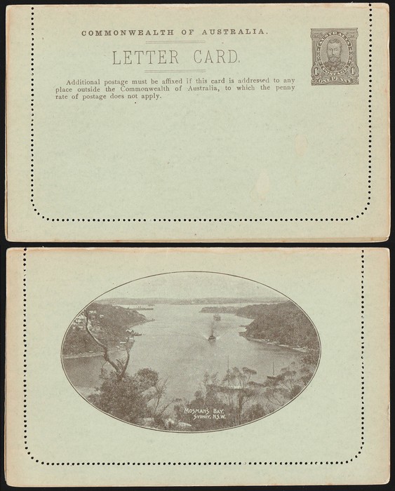 KGV Fullface 1d sepia 1st line ends 'any' on thick greenish stock, with view 'Mosman's Bay Sydney NSW'. F-VF UN. ACSC LC1(78A) cat $400. (P) (Image1) (Image2)