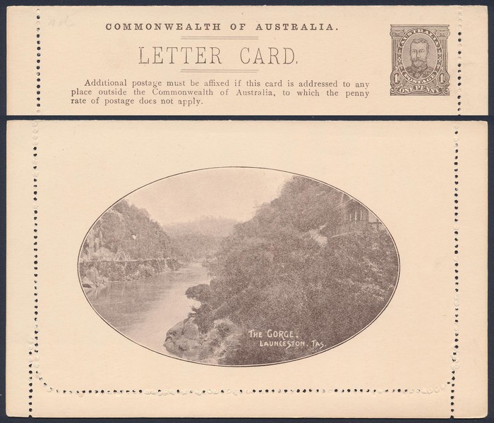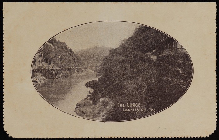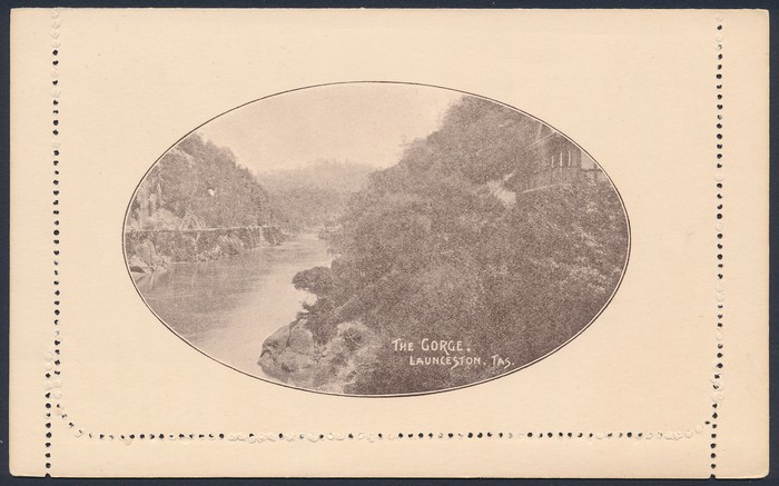 KGV Fullface 1d dark brown on off-white stock, view 'The Gorge Launceston', variety extra vertical perfs at base. Superb fresh UN. ACSC LC3(55A)var cat $300+++. (Image1)