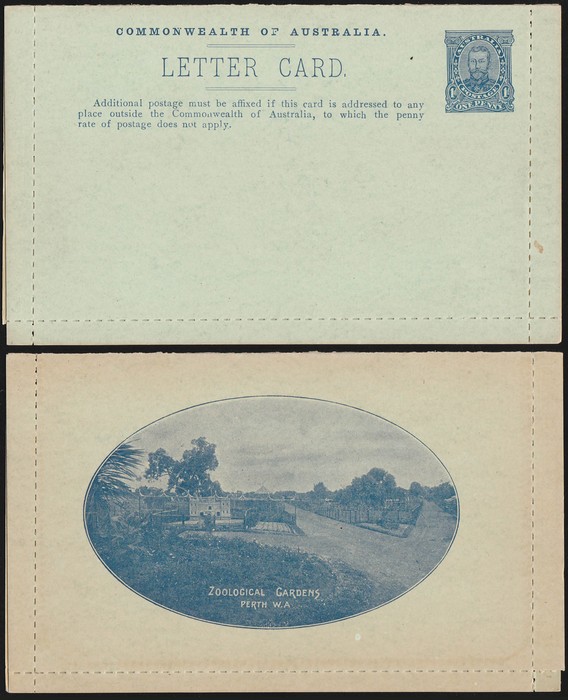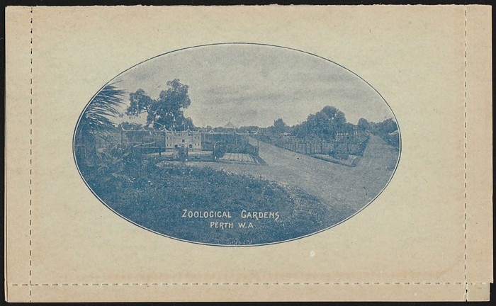 KGV Fullface 1d blue 1st line ends 'any', on green stock, rouletted, view Zoological Gardens Perth WA. F-VF UN, tiny cnr margin piece gone, still superb appearance. ACSC LC5(143A) cat $1000. Very rare. (P) (Image1) (Image2)