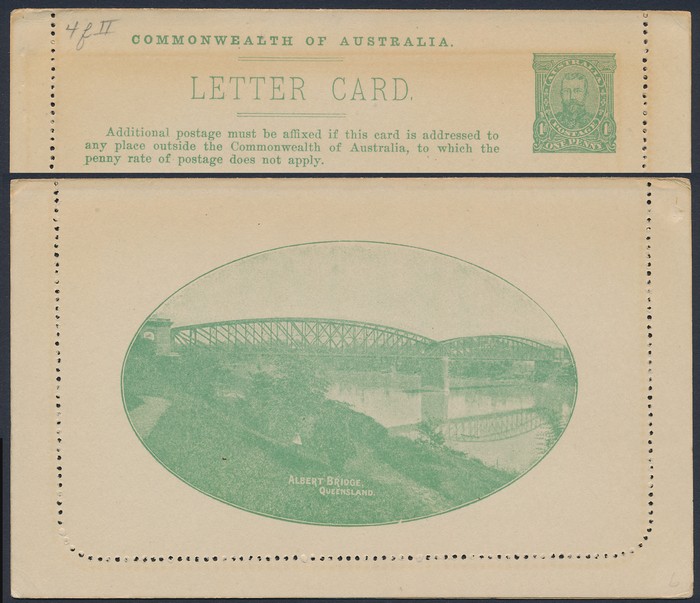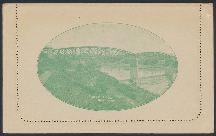 KGV Fullface 1d emerald on greyish, view 'Albert Bridge Queensland'. VF UN, address side sl unevenly aged. ACSC LC8(3A) cat $200. (P) (Image1) (Image2)