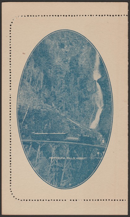 KGV Fullface 1d blue on grey stock, view Montezuma Falls showing train on bridge. VF UN, text side sl suntanned. ACSC LC8(76) cat $300. (P) (Image1) (Image2)