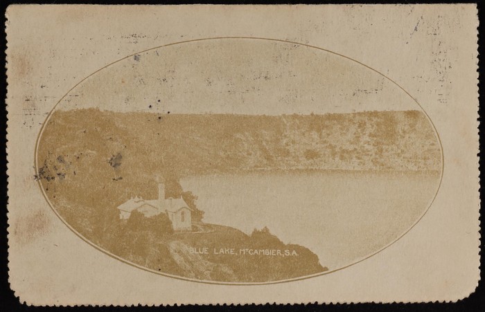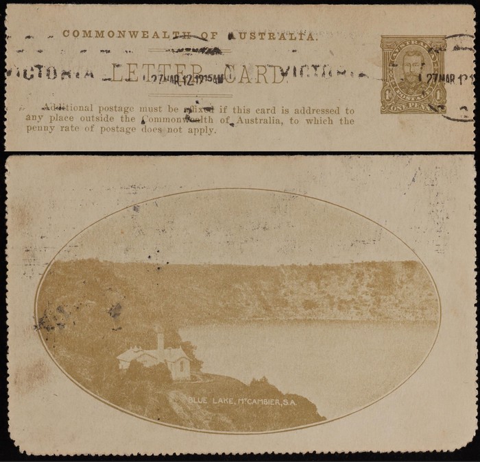 KGV Fullface 1d olive-bistre on rough greyish, view 'Blue lake, Mt Gambier SA' not the usual stock, but thickness, colour & view must be LC10. GU, 'Melbourne 27 MAR 12' pmk. ACSC LC10(12) cat $75. (Image1) (Image2)