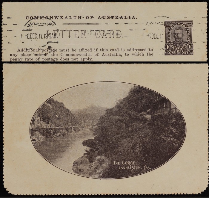KGV Fullface 1d black on grey with comma, view 'The Gorge, Launceston, Tas.' Superb U, 'Melbourne 6 DEC 11' pmk. ACSC LC10(55A) cat $75. (Image1) (Image2)