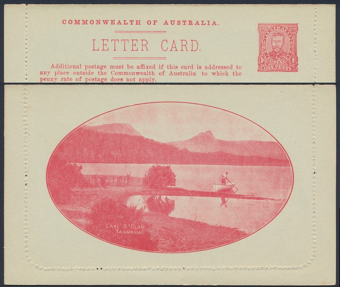 KGV Fullface 1d rose on greenish, view 'Lake St Clair'. Superb UN. ACSC LC10(67A) cat $175. (P) (Image1) (Image2)