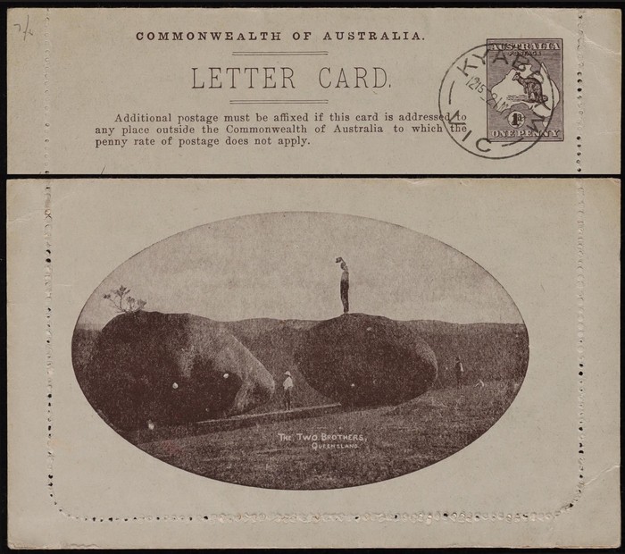 Kangaroo 1d black original die, view The Two Brothers unframed oval w/o sky. VFU with margin, ' Cordalba Qld' cds. ASCS LC14(135D) cat $50+, plus premium with margin.