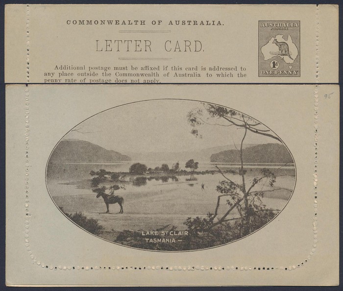 Kangaroo 1d black, die 2, view Lake St Clair Horseman. Superb fresh UN. ACSC LC16(068) cat $175. (Image1) (Image2)