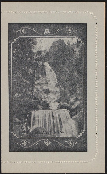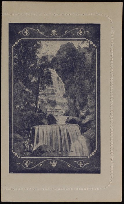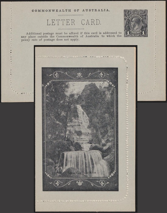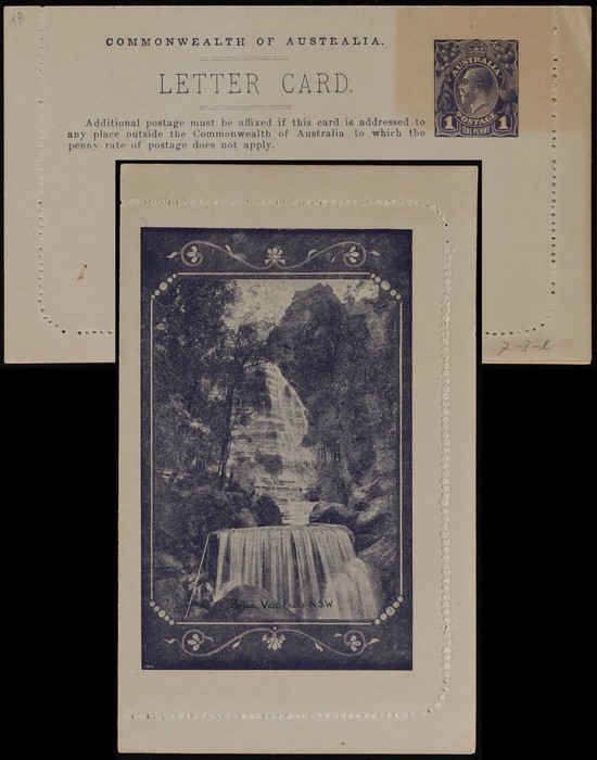 KGV 1d dark violet, die 2, perf 10, view 'Bridal Veil Falls NSW'. F-VF UN, suntanned area text side. ACSC LC21(17) cat $150. (Image1) (Image2)