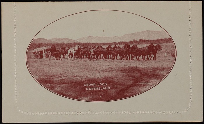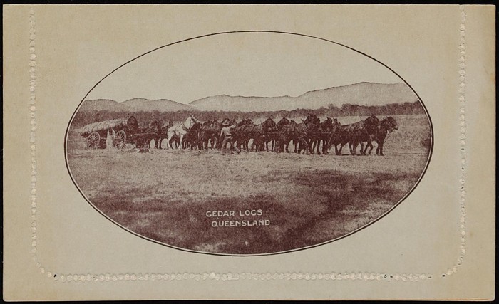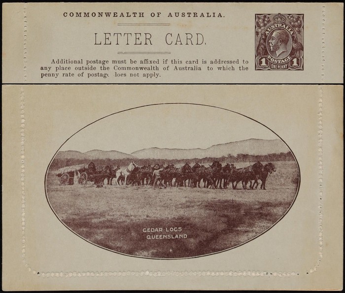 KGV 1d red-brown, die 2, perf 10, view 'Cedar Logs Queensland'. F-VF UN, suntanned top of text side. ACSC LC21(31) cat $150. (Image1) (Image2)