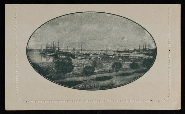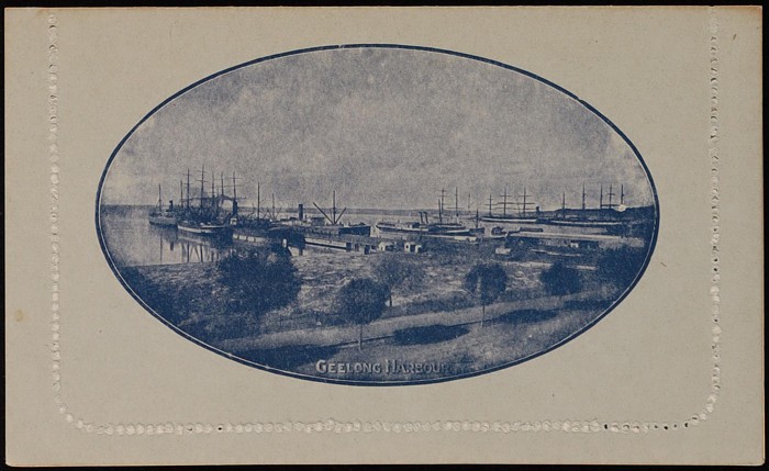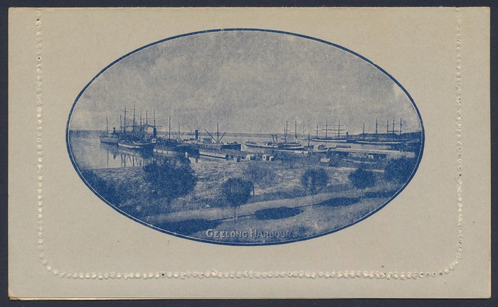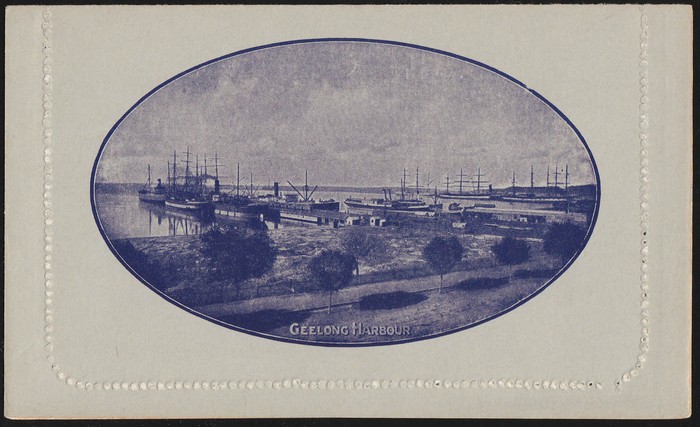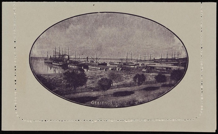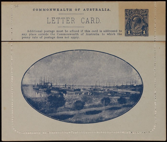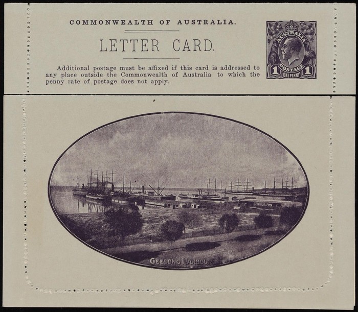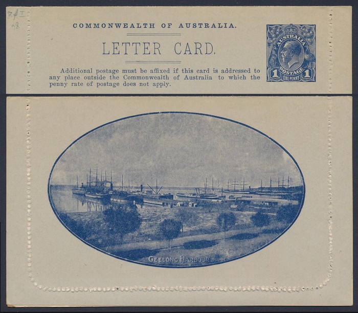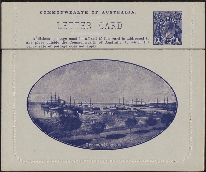 KGV 1d dark blue, die 2, perf 10, view 'Geelong Harbour'. F-VF UN, small suntanned area on text side, view side superb fresh. ACSC LC21(49) cat $150. (Image1) (Image2)