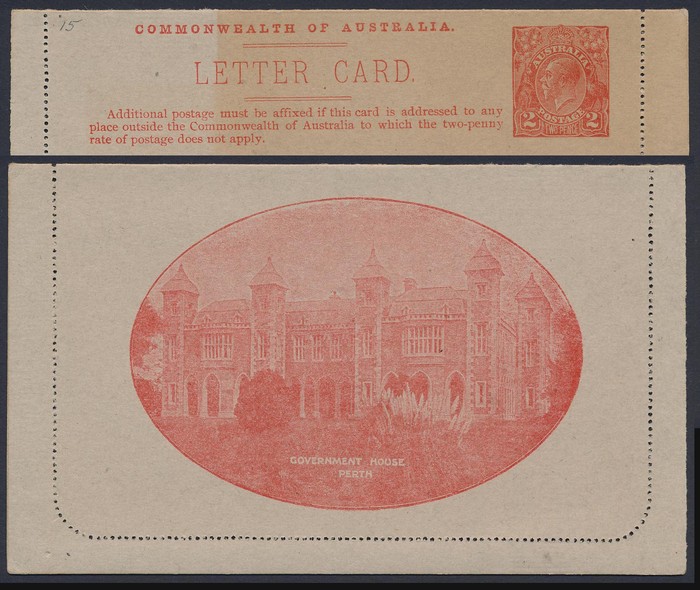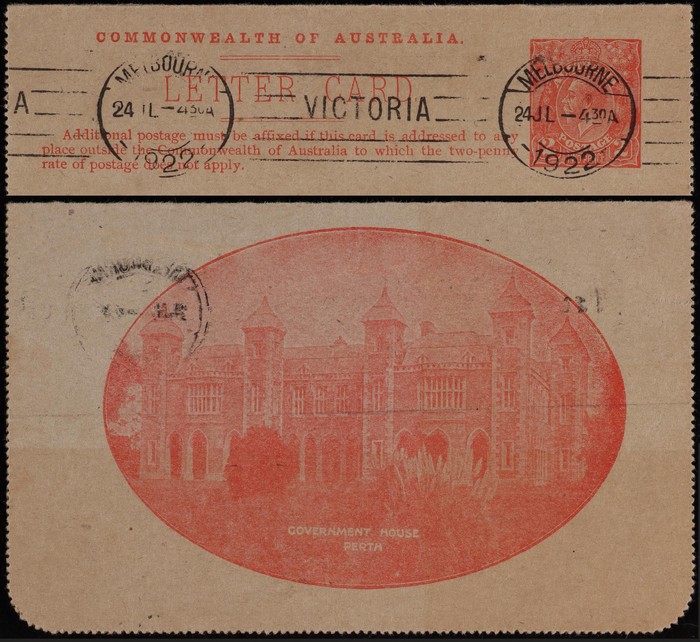 KGV 2d red, view Government House Perth. FU, 'Melbourne 24 JL 1922' pmk. ACSC LC49(56E) cat $100. (Image1) (Image2)