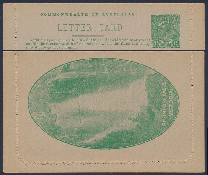 KGV 1½d green, perf 12½, view Trentham Falls. VFU. ACSC LC51(134) cat $500. (P) (Image1) (Image2)