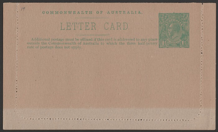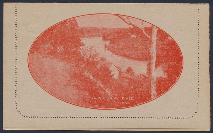 KGV 1½d on 2d red, view Hawkesbury River. F-VF UN, suntanned area on text side. ACSC LC54(62) cat $300. (Image1) (Image2)
