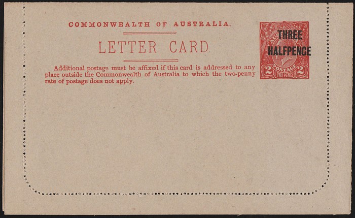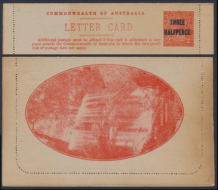 Surch THREE HALFPENCE on KGV 2d red, view Russell Falls. F-VF UN, suntanned both sides. ACSC LC54(118) cat £400. (Image1) (Image2)