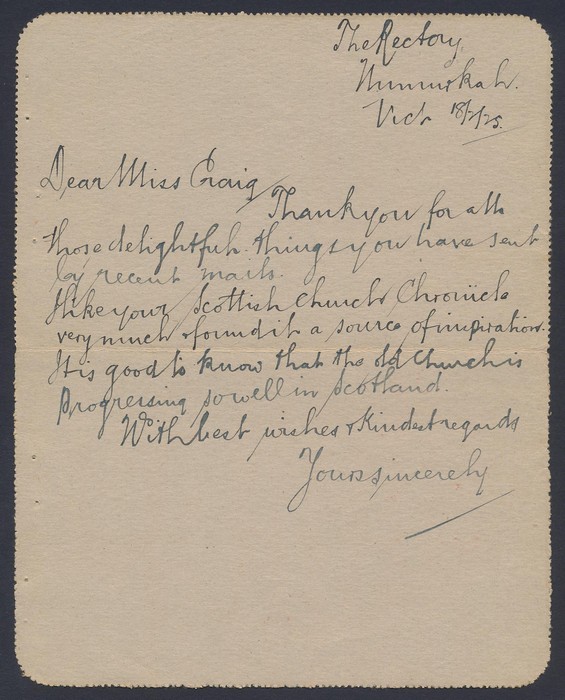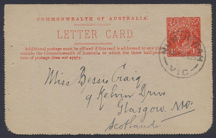 KGV 1½d red on grey stock, view River Yarra. To Scotland. VFU. ACSC LC55 (114) cat $200. (Image1) (Image2)