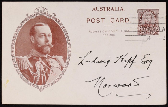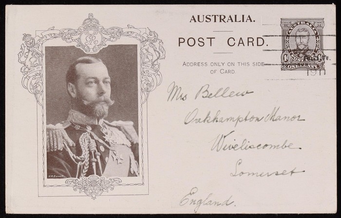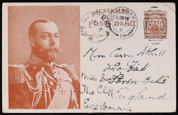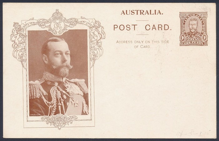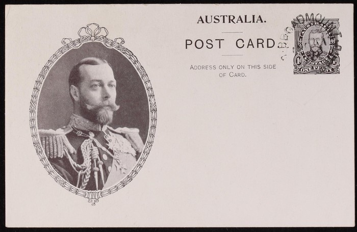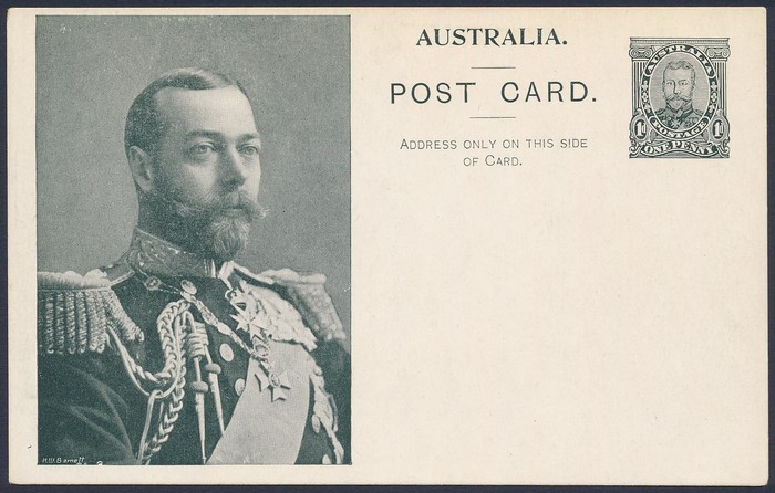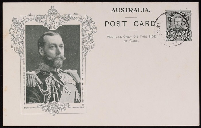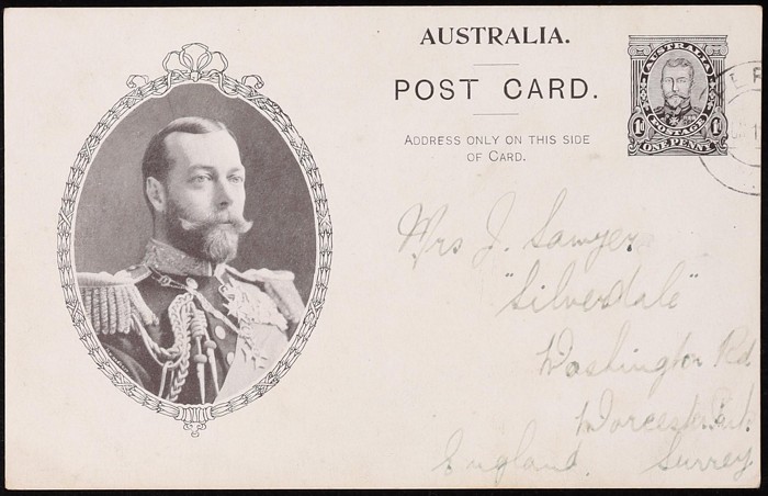 Coronation 1d brownish-black King 51½mm head in rectangle with shaded arms, type 1, white reverse. Superb U, part NSW 1911 pmk. To England. ACSC P5(1)A cat $75+.