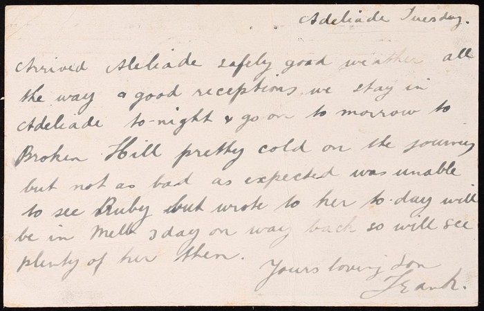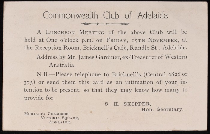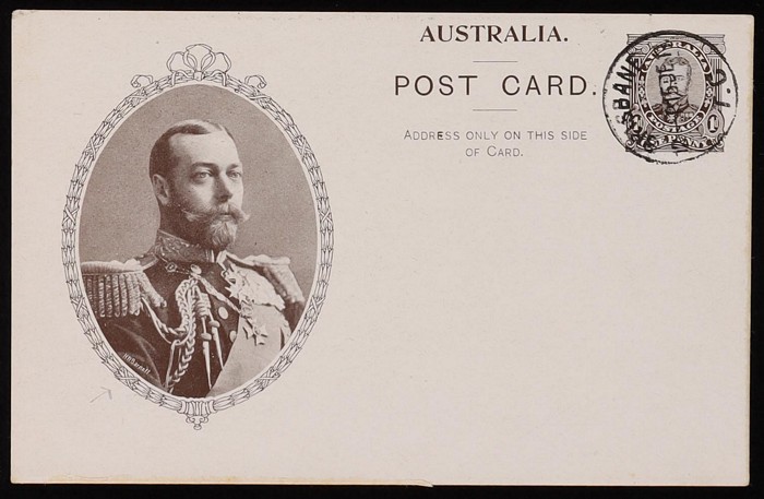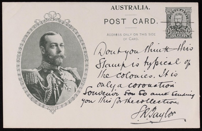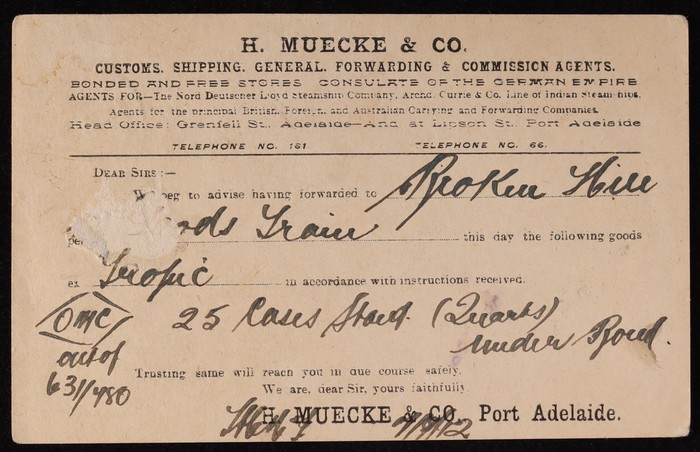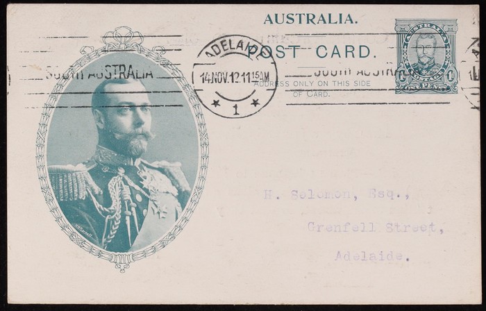 Coronation 1d black King oval laurel leaf frame, type 1, buff reverse with printed message of Muecke & Co Customs Agents. VFU, 'Pt Adelaide 8 SE 12' cds. ACSC P7(1)B cat $75.