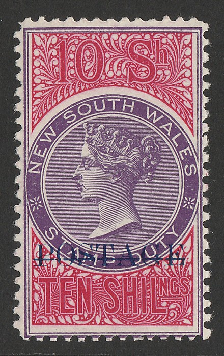blue opt QV 10/- violet & rosine Stamp Duty, wmk NSW sideways, chalk-surfaced paper, perf 12x11. Superb fresh MLH. Scott 76d cat US$350, SG 277b cat £400. (P)
