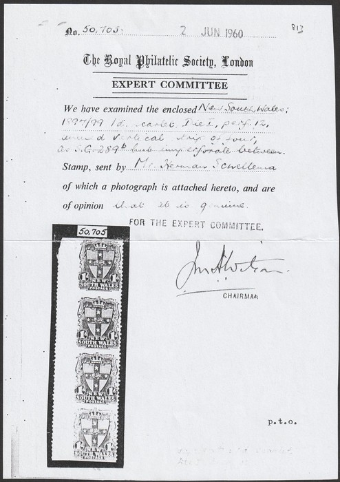 least double, £31,200 = A$62,000 - both for singles, plus premium for sheet. Believed to be unique as sheet of this perf & an important item for NSW specialist. Ex Hutson. (120). (P) (Image1)