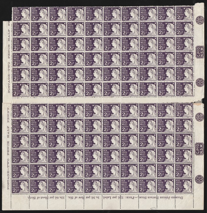 2½d purple Die I, sheet of 120, the 2 panes rejoined, Die I pane with margins at base, left & right inc 'WAC', 'GPrO NSW' & '1897' monograms, plus inscriptions, perf 11x12, & die II pane of 60 with full margins with same monograms, perf 11x12.