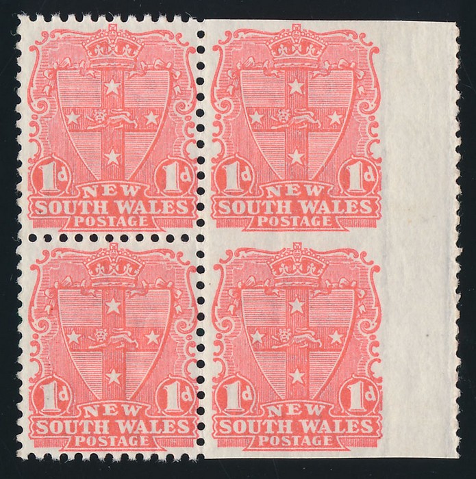 scarlet R marginal blk of 4 error right vert pr IMPERF THREE SIDES (top, bottom & right between stamps & margin), wmk crown NSW (SG w40), chalk-surfaced paper. Superb fresh MNH. SG 300a cat £1200 for M, should be at least double, £2400.