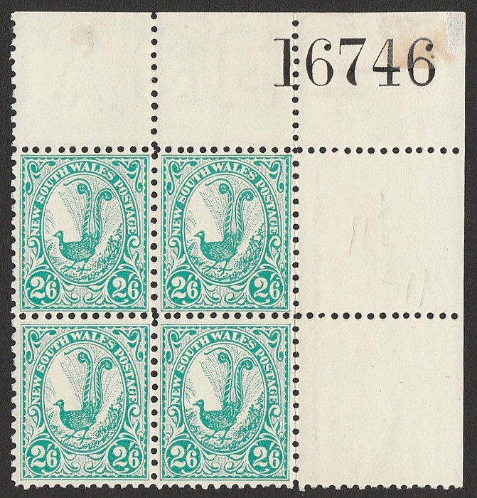 2/6 blue-green UR cnr marginal blk of 4 with sheet no 19746, wmk crown single-lined A, perf 11½x11. Stamps superb fresh MNH. ACSC N65. SG 349a cat £320 for M, singles should be at least double, £640+ MNH, plus premium for