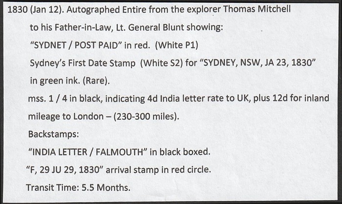 with 'SYDNEY POST PAID' red boxed cachet, with 'Sydney JA 23 1830' dark green despatch cds. From explorer Thomas Mitchell (signed by Mitchell) to his father-in-law Lt Gen Blunt, b/s 'India Letter Falmouth' boxed cachet b/s & an English cds. Rare