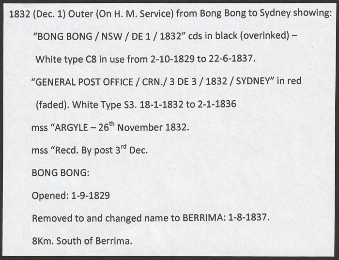 wrapper OHMS with over-inked 'BONG BONG NSW DE 1 1832' cds. To Sydney, endorsed 'Argyle 26th November 1832' with worn 'General Post Office Sydney' arrival crown oval pmk. Very rare. (P) (Image1) (Image2)