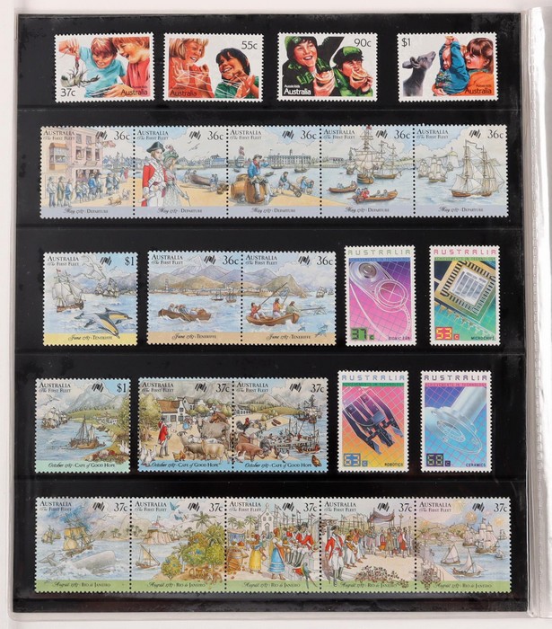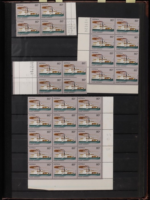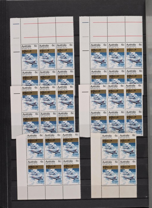 308 imageDecimal Specialised Collection 1966-1982 inc 1966 Navigator 75c Plate 3 upper & lwr marginal blks of 20 (ACSC cat $200) & Plate 1 blk of 4 ($300). $1 Flinders Plate 3 blk of 4 & 40c Tasman cnr blks of 4 (2), total ACSC $630. 1966-1970 4c & 5c Commems (cat $750) with varieties, large multiples inc 1969 Flight blks inc 1970 Railway 5c aniline print & comp sheets inc 1966 Lifesaving, 1968 Soil/Medical & 1970 Grasslands. 1970-74 6c & 7c Commems inc blks & multiples (cat $620) inc 1971 Christmas 7c blks of 7 (4) & blk of 25, 1974 Sports set marginal colour lwr blk of 20. Other Issues to end 1974 inc 1971 Coil 7c Sturt's Desert Pea vert pr, error 'missing buff & misplaced green' (ACSC cat $600), plus 4 diff wrappers ($100), 1972 Pioneer Life study 5c to 80c (cat $530). 1972 Christmas set cnr blk of 8. 1973 Nat Dev sheet num blks of 4 (cat $100). 1974 Christmas selection (cat $200) inc 10c blk of 20 with Prominent white paper fold, 35c Plate 3 gutter blk of 20. 1974 Education set gutter blks of 20 (cat $120). 1975 Environmental ranges 10c Pollution cnr blk of 16 & Fire blk of 25, both perf 14¾, cat $150. 1975 10c IWY aniline print blk of 4 (ACSC cat $200), Christmas 15c strip of 5 & Christmas 45c blk of 4. 1977 QEII SJ study. 1979 NSW Football booklets for Bexley, Parramatta & Rockdale (cat $670). 1980 Airplane 22c IMPERF strip of 4 ($400) & 22c High Court aniline print lwr marginal gutter blk of 12 (cat $240). 1985 Conservation 90c Energy aniline print gutter blk of 4. 1993 Counter printed stamp trials 45c, $1, NVI 'Candlesticks' vert prs (retail $600), 1996 Indonesia joint issue Cuscus booklets (2, cat $200) & much more inc 1978 Bird Study. Some toning, mostly in the sheets, o/w generally fresh MNH total ACSC/retail $6500. (Image1) (Image2) (Image3) (Image4) (Image5) (Image6) (Image7) (Image8) (Image9) (Image10) (Image11) (Image12) (Image13) (Image14) (Image15) (Image16) (Image17) (Image18) (Image19) (Image20) (Image21) (Image22) (Image23) (Image24) (Image25) (Image26) (Image27) (Image28) (Image29) (Image30) (Image31) (Image32) (Image33) (Image34) (Image35) (Image36) (Image37) (Image38) (Image39) (Image40) (Image41) (Image42)