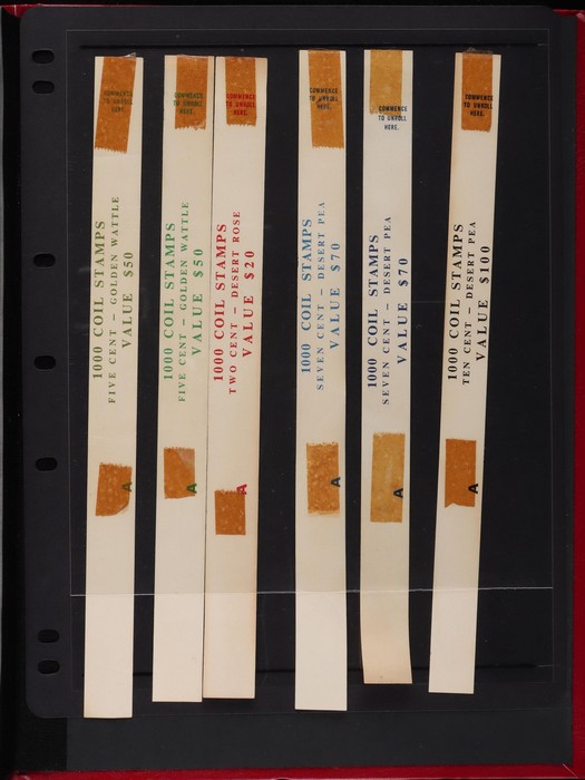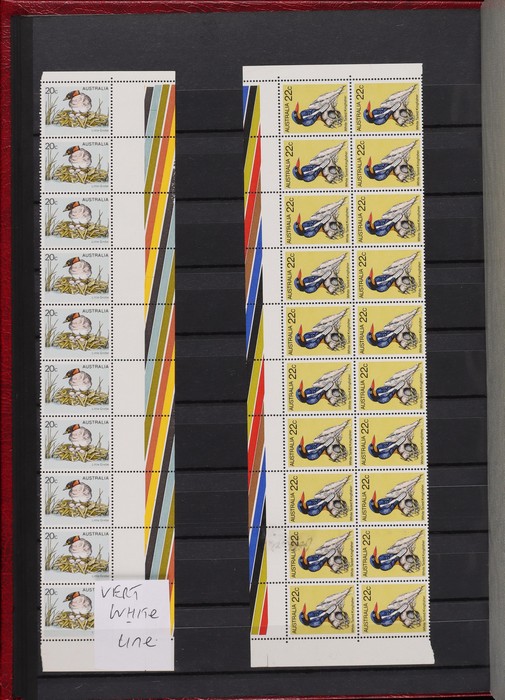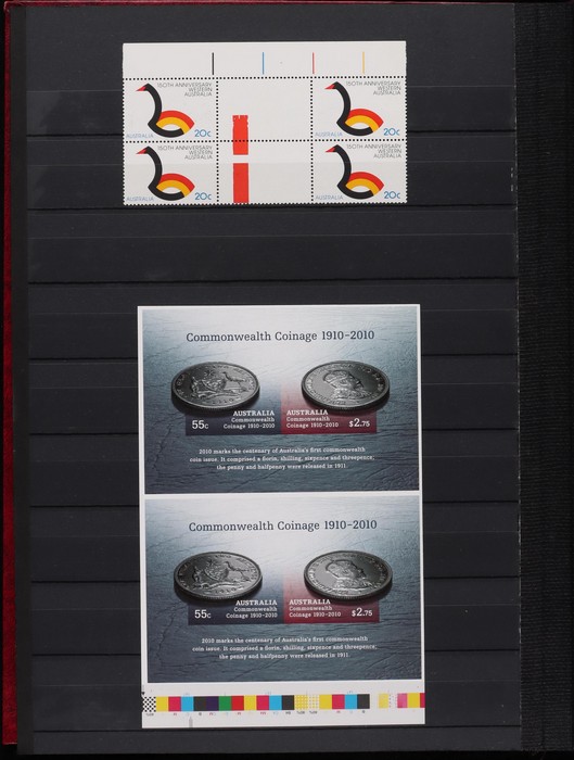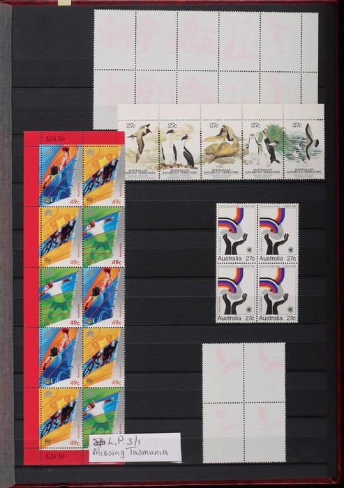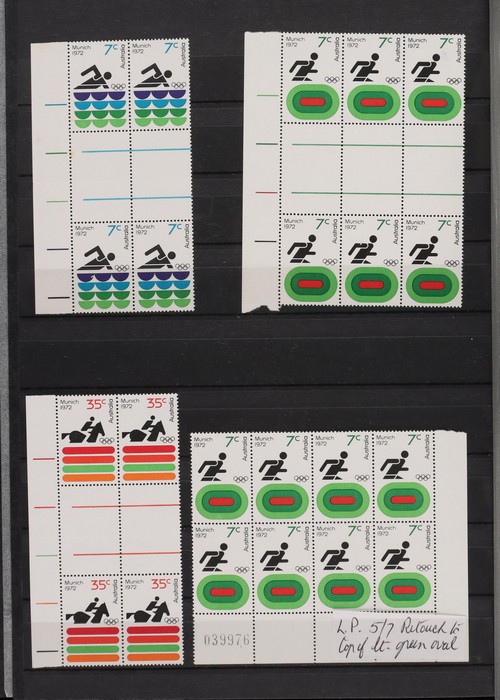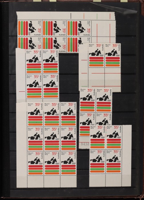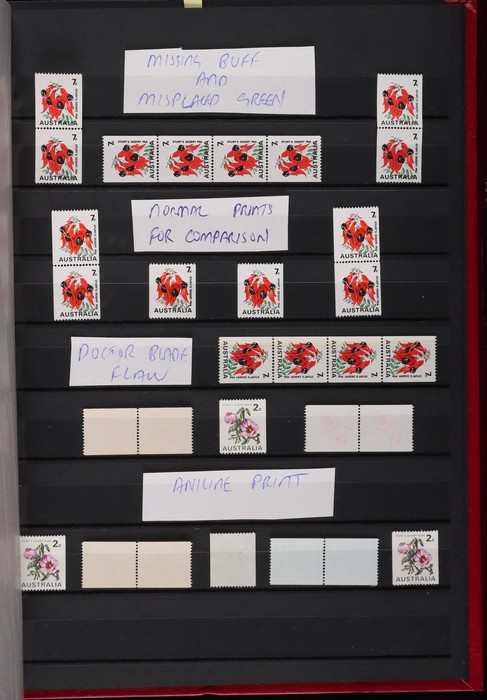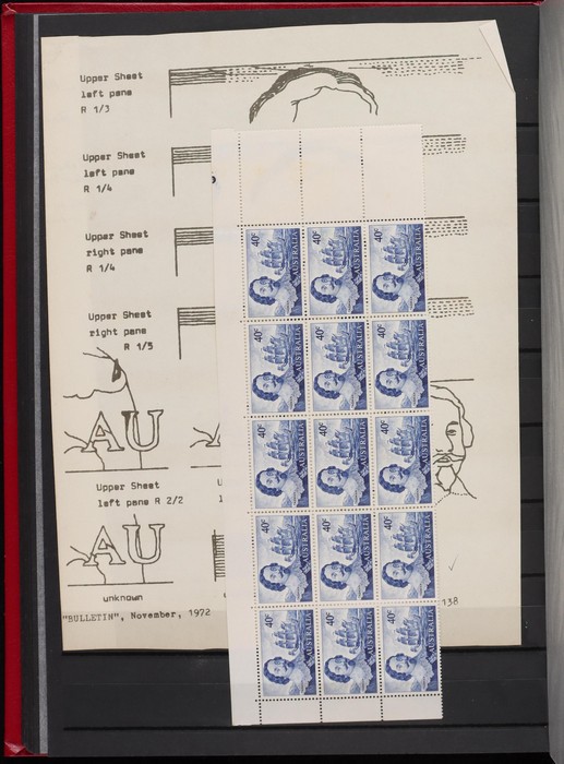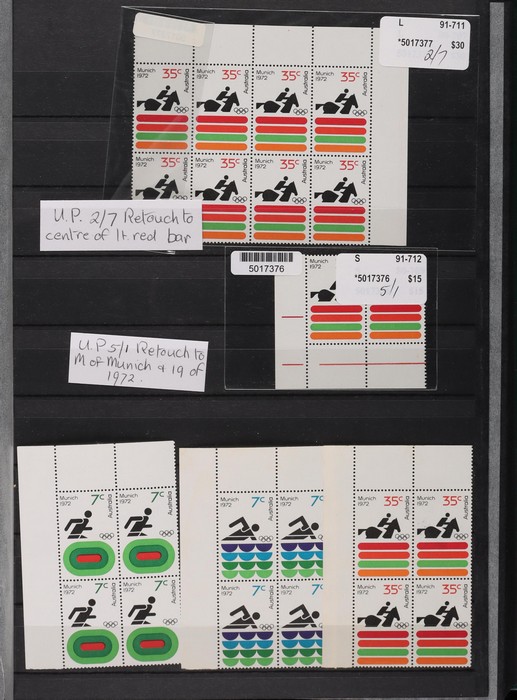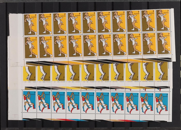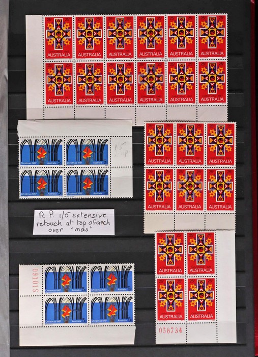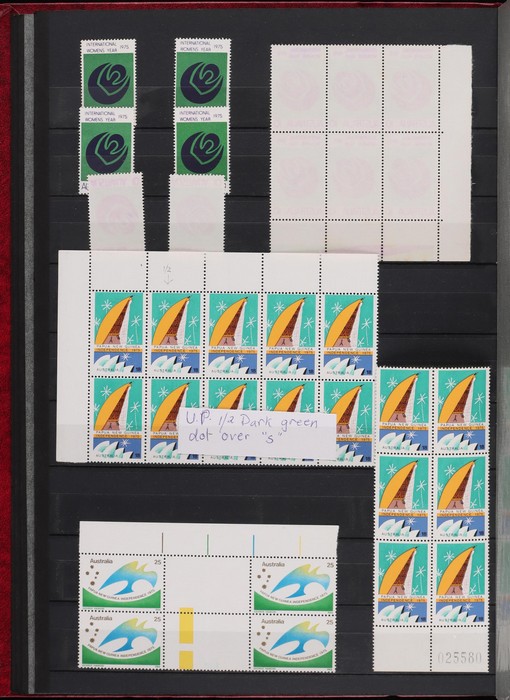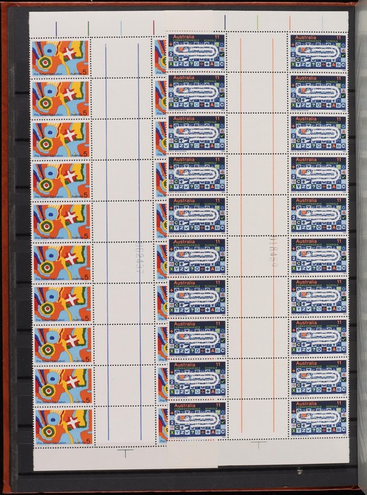 309 imageDecimal specialised collection 1966-82 with 1966 QEII 1c-6c (ACSC cat $800) inc 4c red plate number blks of 20 (8, cat $240). 1966 Birds 13c LR cnr blk of 15 with red sheet numbers, 24c lower pane of 30, 30c LL cnr blk of 4 with Autotrons & 20c Whistler 'partial missing grey colour in LR cnr' pr. 40c Tasman UL cnr blk of 15 (5x3) with ACSC listed variety 'missing left serif on U of Australia' (Pos 2/2) & 're-cut shading left of hair' (Pos 2/3), ACSC cat $250. 1966 Flinders cnr single 're-cut clouds' plus blk of 6 UR stamp 'retouched UL cnr'. Extensive 1966-70 4c & 5c Commems in positional multiples with sheet numbers & varieties (ACSC cat $1230) inc 1968 soil/medical thick bar gutter blks (8) inc 'needle in thumb' errors sheet numbers & Autotrons. 1969 Flight right pane of 50 plus other multiples (5). 1970 Cook 5c study. Other 1967-70 pieces inc 1968 Flowers 15c & 30c lower marginal sheet number blks of 20, 1967 Christmas 25c LL cnr blk of 12, 1969 Prime Ind 7c part pane of 30, plus 15c & 25c sheet number blks of 20. 1969 Christmas 25c multiples, 1970 Cook M/Sheet with Fake ANPEX opt. 1970 coil collection inc 2c aniline print prs (2), 7c missing buff & misplaced green strip of 4 & 2 prs, ACSC cat $300 ea, total $2400. 1970-73 6c & 7c Commem multiples (cat $1350) inc 1970 QANTAS 6c L & R panes of 50, 1971 RAAF 6c study, 1971 Christmas 7c blks of 25 (3) inc white paper with red sheet number. 1972 Olympics collection & 1973 Fam Aust blks & multiples. 1974 Christmas study inc 10c plate number blks of 4 (7), plate 5 LL cnr blk of 35, plate 1 cnr blk of 12 & 35c plate 3 blks of 4 (3) & upper pane blk of 30 (10x3). 1974 UPU collection inscription SPECIMEN opts, non Olympic Sports 7c set of 7 colour bar blks of 20. 1975 IWY 10c aniline violet printing cnr blks of 6 & 2 singles (ACSC cat $50 ea, total $400). 1978 Birds to 55c, Autotron gutter blks of 20. 1979 Fishing set Autotron gutter blks of 20. Plus others inc 1980s Frama printing errors, 1983 Airplane 20c imperf, 1992 candlestick tester set of 3 trial Self-Adhesives vert prs (unlisted ACSC, retail $1600) & 1993 set of 6 proofs w/o vals as issued (ACSC cat $400) plus much more. Appears fresh & clean throughout, total ACSC/retail $10,300. (Image1) (Image2) (Image3) (Image4) (Image5) (Image6) (Image7) (Image8) (Image9) (Image10) (Image11) (Image12) (Image13) (Image14) (Image15) (Image16) (Image17) (Image18) (Image19) (Image20) (Image21) (Image22) (Image23) (Image24) (Image25) (Image26) (Image27) (Image28) (Image29) (Image30) (Image31) (Image32) (Image33) (Image34) (Image35) (Image36) (Image37) (Image38) (Image39) (Image40) (Image41) (Image42) (Image43) (Image44) (Image45) (Image46) (Image47) (Image48) (Image49)
