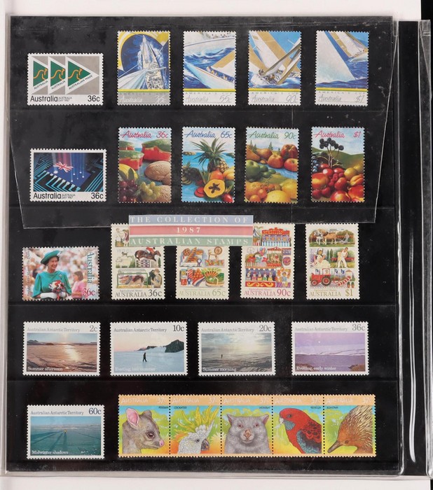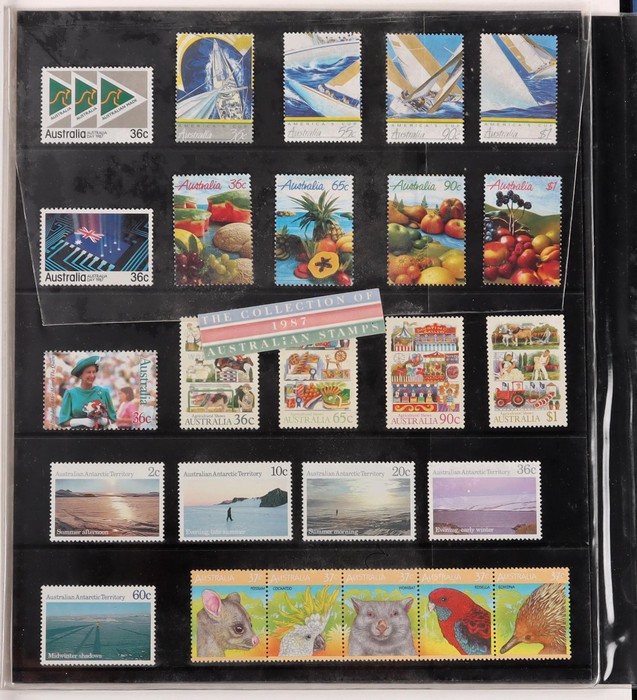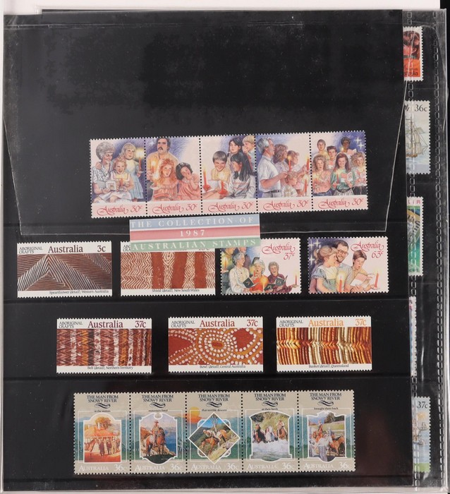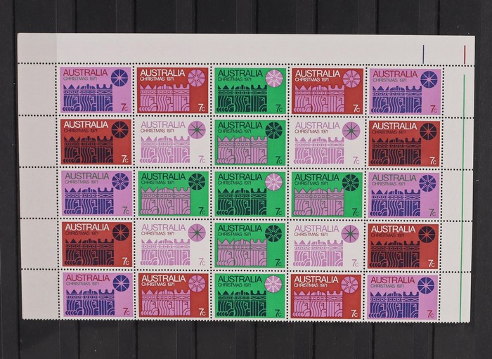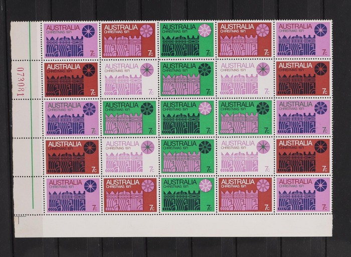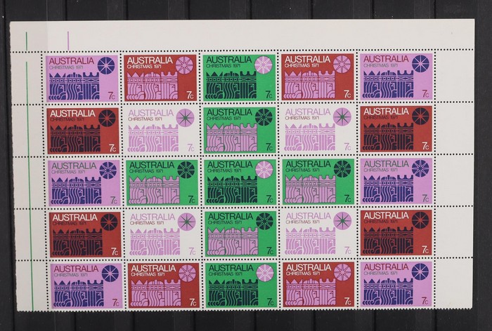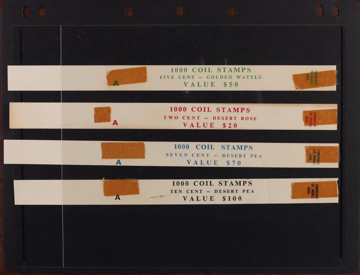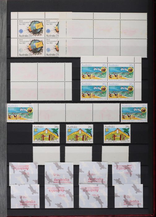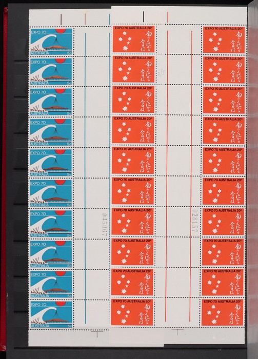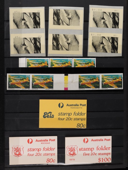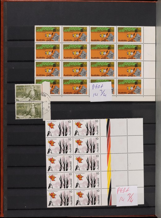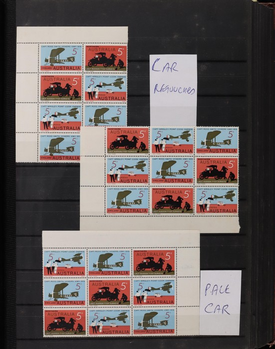 309 imageDecimal specialised collection 1966-82 with 1966 QEII 1c-6c (ACSC cat $800) inc 4c red plate number blks of 20 (8, cat $240). 1966 Birds 13c LR cnr blk of 15 with red sheet numbers, 24c lower pane of 30, 30c LL cnr blk of 4 with Autotrons & 20c Whistler 'partial missing grey colour in LR cnr' pr. 40c Tasman UL cnr blk of 15 (5x3) with ACSC listed variety 'missing left serif on U of Australia' (Pos 2/2) & 're-cut shading left of hair' (Pos 2/3), ACSC cat $250. 1966 Flinders cnr single 're-cut clouds' plus blk of 6 UR stamp 'retouched UL cnr'. Extensive 1966-70 4c & 5c Commems in positional multiples with sheet numbers & varieties (ACSC cat $1230) inc 1968 soil/medical thick bar gutter blks (8) inc 'needle in thumb' errors sheet numbers & Autotrons. 1969 Flight right pane of 50 plus other multiples (5). 1970 Cook 5c study. Other 1967-70 pieces inc 1968 Flowers 15c & 30c lower marginal sheet number blks of 20, 1967 Christmas 25c LL cnr blk of 12, 1969 Prime Ind 7c part pane of 30, plus 15c & 25c sheet number blks of 20. 1969 Christmas 25c multiples, 1970 Cook M/Sheet with Fake ANPEX opt. 1970 coil collection inc 2c aniline print prs (2), 7c missing buff & misplaced green strip of 4 & 2 prs, ACSC cat $300 ea, total $2400. 1970-73 6c & 7c Commem multiples (cat $1350) inc 1970 QANTAS 6c L & R panes of 50, 1971 RAAF 6c study, 1971 Christmas 7c blks of 25 (3) inc white paper with red sheet number. 1972 Olympics collection & 1973 Fam Aust blks & multiples. 1974 Christmas study inc 10c plate number blks of 4 (7), plate 5 LL cnr blk of 35, plate 1 cnr blk of 12 & 35c plate 3 blks of 4 (3) & upper pane blk of 30 (10x3). 1974 UPU collection inscription SPECIMEN opts, non Olympic Sports 7c set of 7 colour bar blks of 20. 1975 IWY 10c aniline violet printing cnr blks of 6 & 2 singles (ACSC cat $50 ea, total $400). 1978 Birds to 55c, Autotron gutter blks of 20. 1979 Fishing set Autotron gutter blks of 20. Plus others inc 1980s Frama printing errors, 1983 Airplane 20c imperf, 1992 candlestick tester set of 3 trial Self-Adhesives vert prs (unlisted ACSC, retail $1600) & 1993 set of 6 proofs w/o vals as issued (ACSC cat $400) plus much more. Appears fresh & clean throughout, total ACSC/retail $10,300. (Image1) (Image2) (Image3) (Image4) (Image5) (Image6) (Image7) (Image8) (Image9) (Image10) (Image11) (Image12) (Image13) (Image14) (Image15) (Image16) (Image17) (Image18) (Image19) (Image20) (Image21) (Image22) (Image23) (Image24) (Image25) (Image26) (Image27) (Image28) (Image29) (Image30) (Image31) (Image32) (Image33) (Image34) (Image35) (Image36) (Image37) (Image38) (Image39) (Image40) (Image41) (Image42) (Image43) (Image44) (Image45) (Image46) (Image47) (Image48) (Image49)