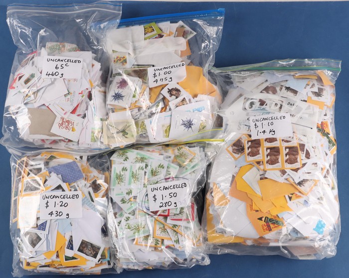 313 imageDecimals: 65c (450g), $1 (465g), $1.10 (1.35kg), $1.20 (420g), $1.50 (270g) all on close-clip single paper, uncancelled. Based on 380 stamps for 100g FV estimate $12,000+. (Approx 3kg) (Image1)