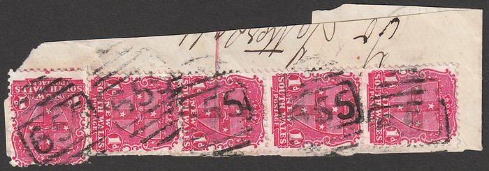 655 of Stoney Creek type 4B (RRRRR) 5 strikes on 1897 1d Shield 1d strip of 5 tied to large piece with Strong Point b/s. (P) (Image1)