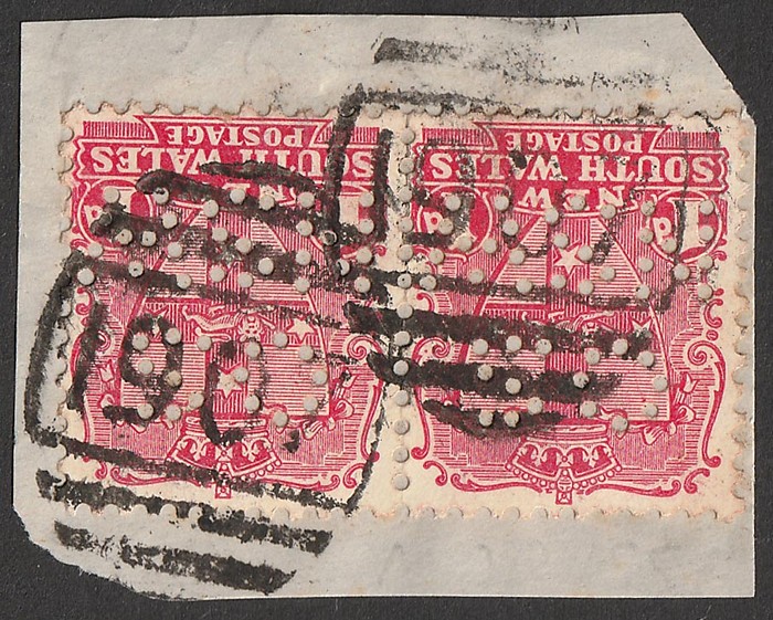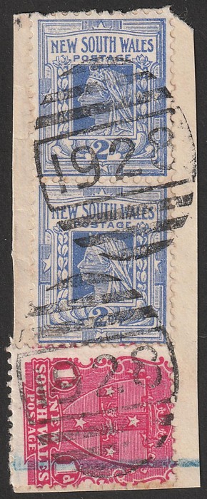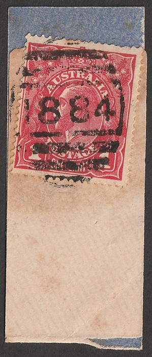 1907 of Morisset (RRRR), 2 F-VF strikes tying 1d Shields (2) to small piece. (P) (Image1)
